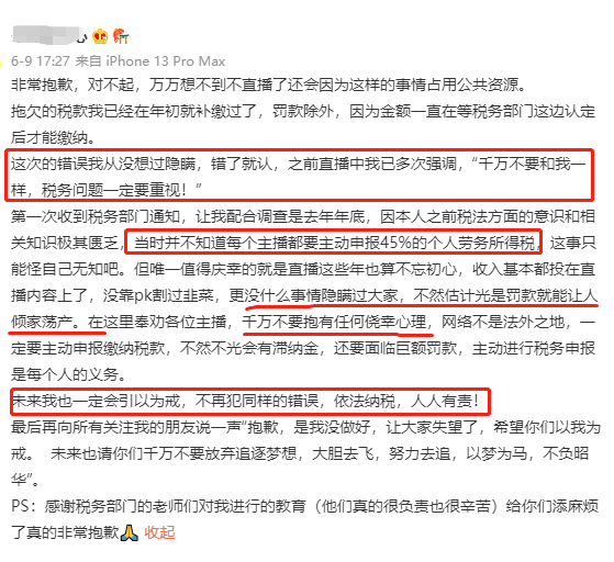 事件发生后,当事主播马上发了微博,为自己漏税的行为进行道歉,并奉劝其他人:千万不要抱有任何侥幸心理,一定要主动申报缴纳税款,不然不光会有滞纳金,还要面临巨额罚款,及时进行税务申报是每个人的义务。