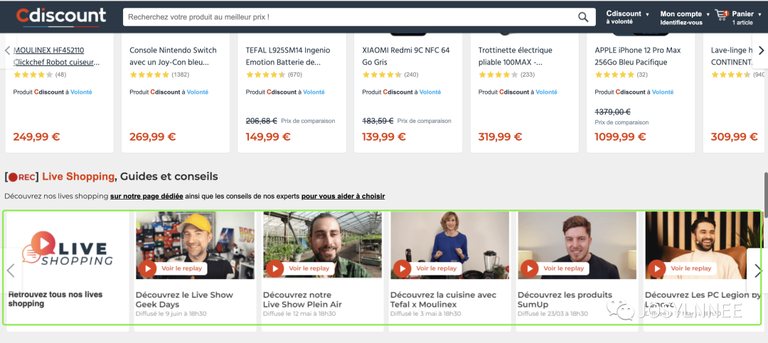 众所周知,Cdiscount的首页是流量比较高的地方,因此产品如果是有参与Liveshopping的推广的话是可能会在前台的页面出现的,如果不出现在项目栏,也可以通过点击Liveshopping进入到详细页面,里面就会有不同的产品的介绍和解说。