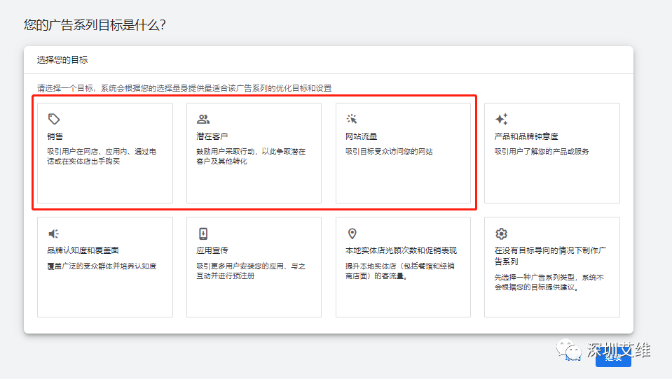 首先,在搜索广告中我们需要确定我们的营销目标,在搜索广告中可以选择:"销售"、"潜在客户"或"网站流量"。