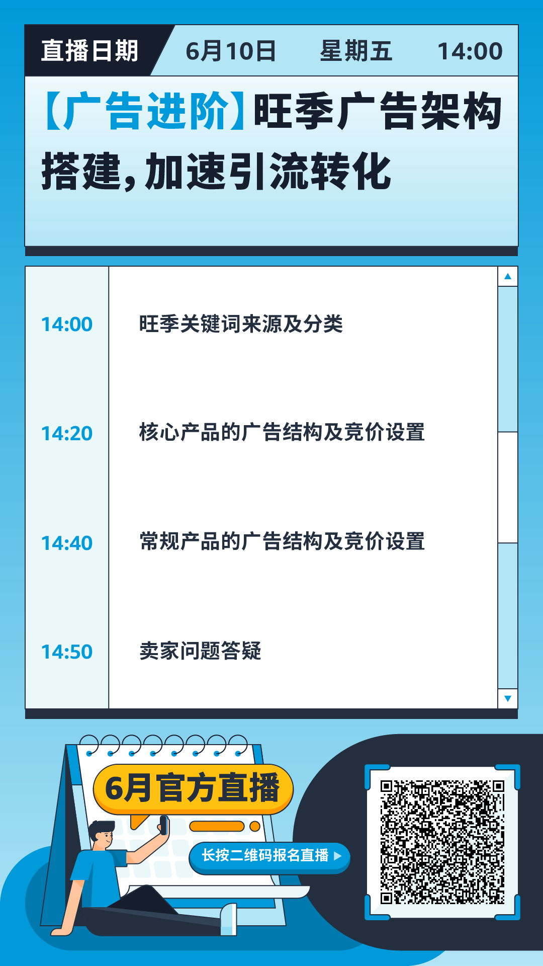 各位卖家可在下方目录选择感兴趣的内容,滑动到对应的直播板块,长按二维码预约直播哦~