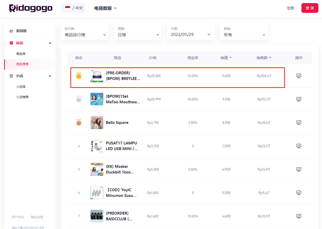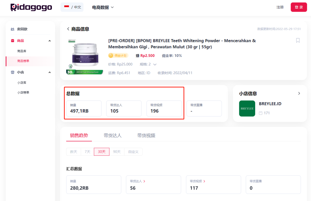 根据didagogo数据显示,@brreylee.id售卖的美白粉在5-29单日排名第一。