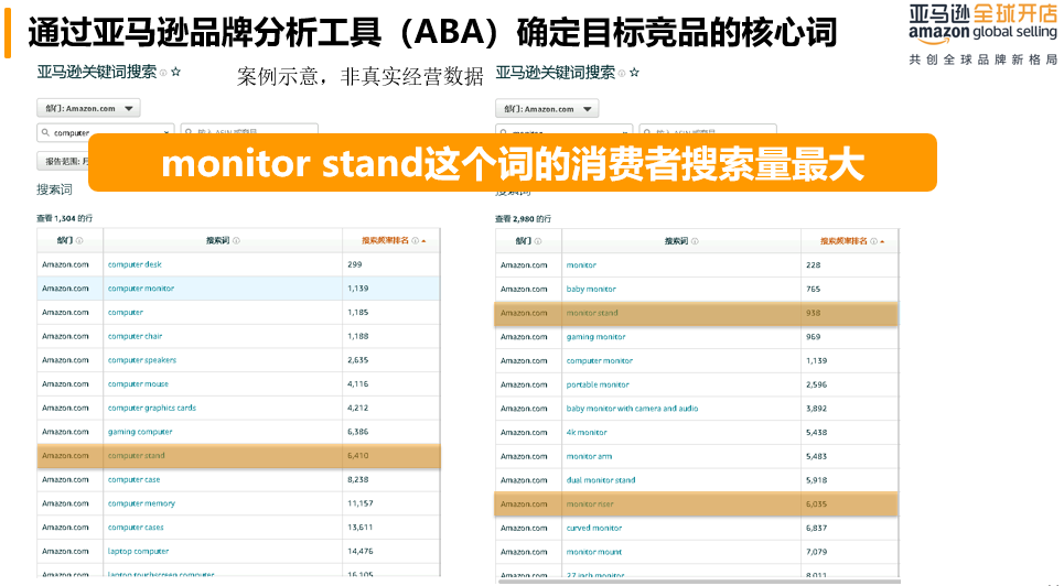 小爱通过亚马逊品牌分析工具,查看了过去一整个月的搜索频率排名,可以看到相关度低的"computer stand"的搜索频率排到了6410名;"monitor stand"排在938名,"monitor riser"排在6035名。很显然"monitor stand"搜索量最大。同时,ABA搜索排名还反映了市场容量,搜索的人多,说明市场容量大,但竞争可能也会相对激烈。