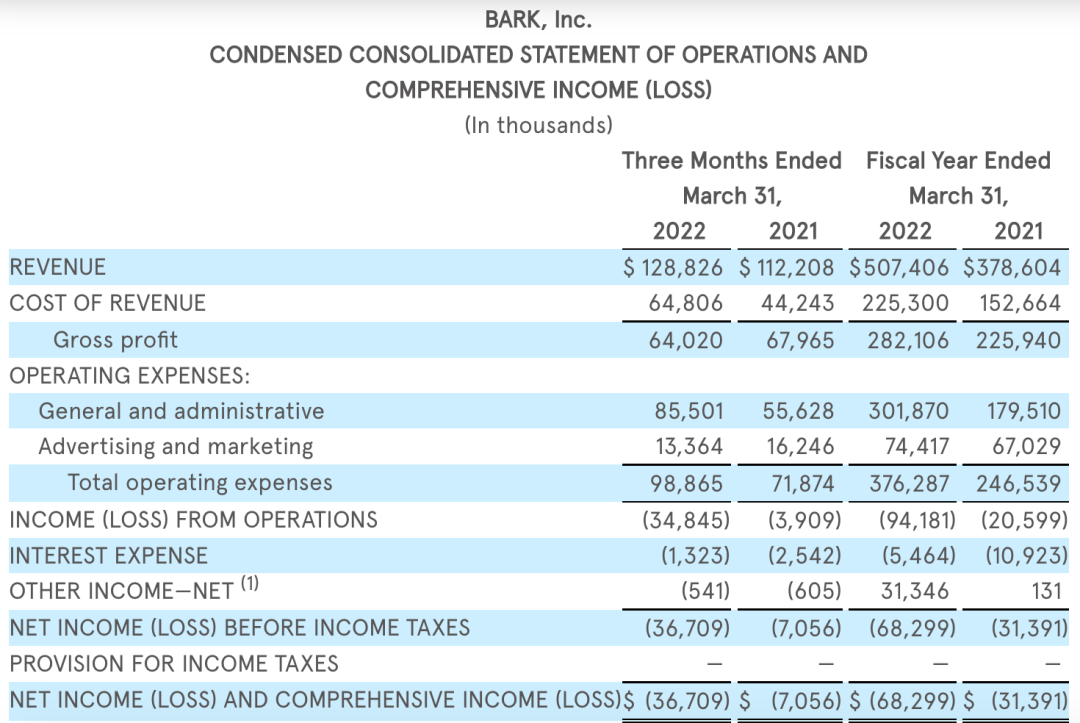 北美DTC宠物用品大牌、订阅电商鼻祖之一的Bark(BarkBox),截至2022年3月31日结束的2022年财年,营业收入同比增长34%,突破5亿美金,达到5.074亿美金。