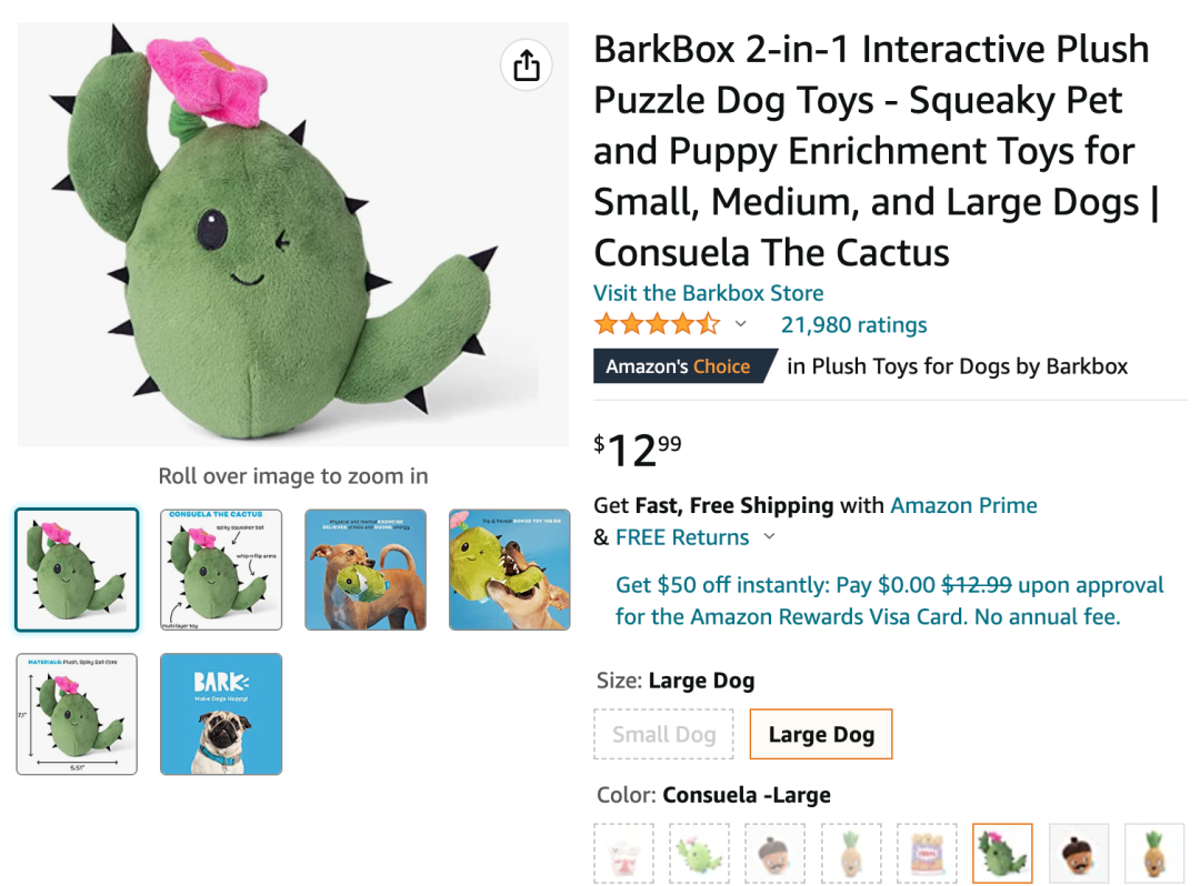 例如,BarkBox的一款狗狗毛绒玩具,2019年在亚马逊上架,售价12.99美金,3年之内就积累了超过2万个评价,用户的反馈都很不错,妥妥就是一个可以长期躺赚的爆款。