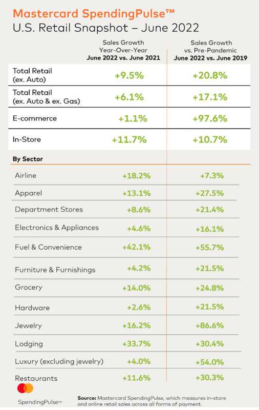 AMZ123获悉,根据万事达卡SpendingPulse的数据,6月份美国零售总额(不包括汽车经销商、加油站和餐馆)同比增长9.5%,增长高于预期。