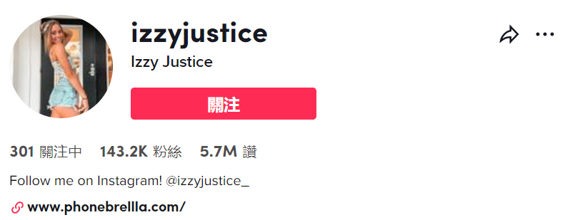 @izzyjustice在TikTok简介中标注了自己的ins账号,可以通过TikTok引流到自己ins上成为粉丝。