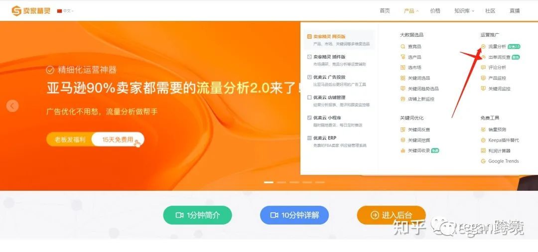 首先给大家推荐的反查链接流量关键词的工具是卖家精灵,是比较全面的帮助我们进行关键词反查以及关键词排名监控的工具,打开首页后选择流量反查两个工具: