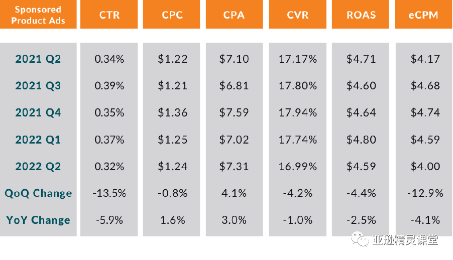 品牌推广广告CPA环比增长 3.8%,在 2022 年第二季度升至 9.87 美元。CPA 在去年全年波动,但总体同比增长 9.4%。商品推广广告 CPA 在 2022 年第一季度略有下降,但环比回升。2022 年第二季度的商品推广 CPA 为 7.31 美元,环比增长 4.1%,同比增长 3.0%。CPA整体的增长趋势对于客单价低的商品是不利的信号,卖家应该尽可能地采用提高客单价的各种策略。