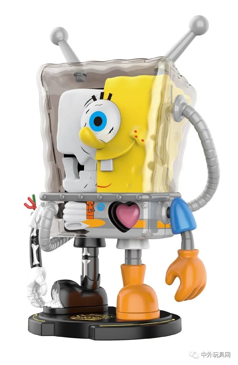 在海绵宝宝角色形象上加入太空、骨架元素,使之更具有潮玩产品属性。在设计中加入了机械联动装置,转动左手手臂可以带动心脏部件前后活动,增加产品趣味性和可玩度。底座采用磁吸固定,具有创新性质。部分部位需要拼装组合,增强可玩性和动手能力。