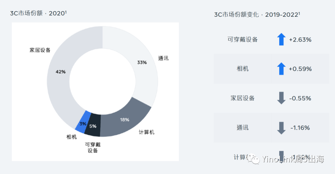 在细分市场方面,面对全球的发展机遇和挑战,不同细分品类的表现逐渐分化,其中以可穿戴设备、相机为代表的新兴品类不断斩获更多的市场份额,而传统细分品类如家具设备等增长的空间相较有限。