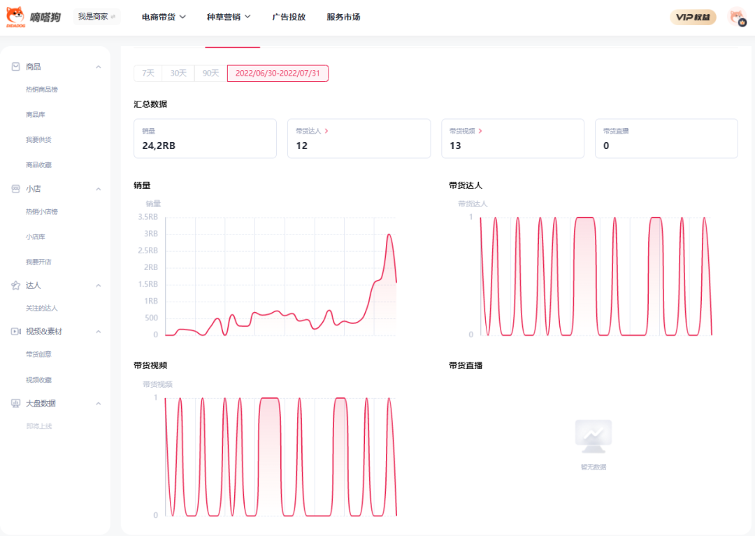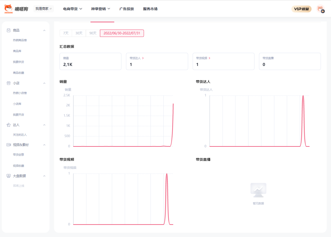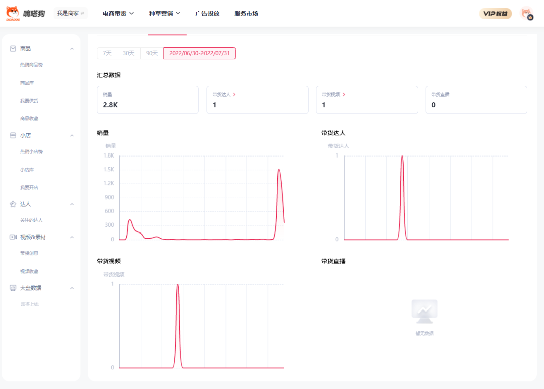 通过嘀嗒狗数据可发现这款智能喷雾拖把在过去的一个月几乎无销量,7-30仅出1单,但7-31迎来了销量的大爆涨,销量急剧上升,日出两千单,并占据热销排行榜的第二名。
