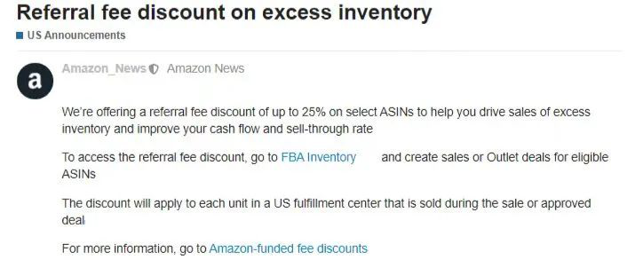 这意味着卖家之前清理20美元的商品,佣金为3.00美元,现在打折之后平台佣金最高将减少0.75美元,降为2.25美元。要获得推荐费折扣,卖家需要访问亚马逊物流库存并为符合条件的ASIN创建销售或奥特莱斯交易。