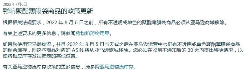 2022年8月5日后,移除在亚马逊运营中心剩余的不透明或单色聚酯薄膜袋的库存。