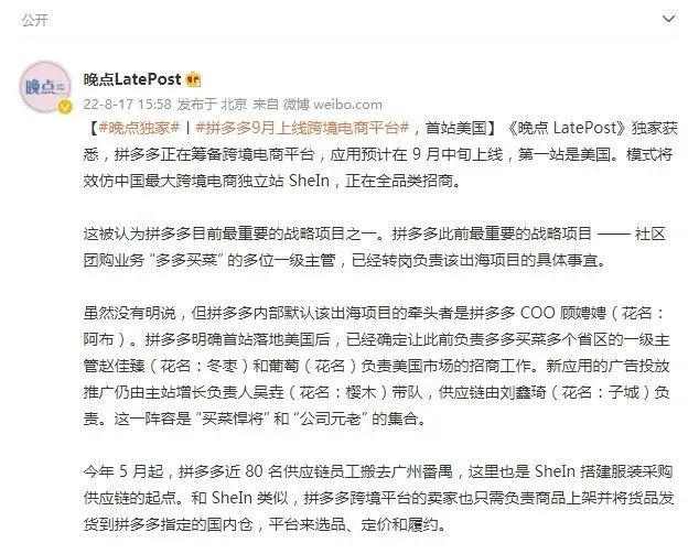 据《晚点Latepost》最新消息,拼多多的跨境电商平台,预计于9月上线。其第一站,将是美国。