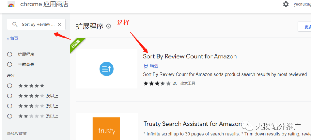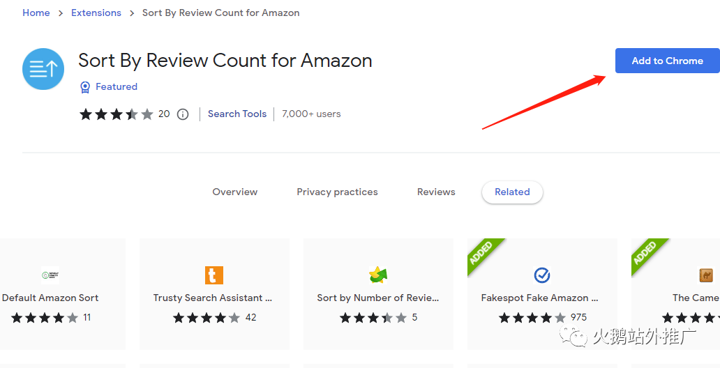 打开谷歌应用商店输入:Sort By Review Count for Amazon,选择该插件,最后点击添加到chrome