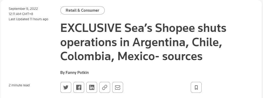 Shopee 阿根廷站点的网站消息显示:"我们很遗憾地通知您,Shopee Argentina 将从 2022 年 9 月 8 日上午 10:00 开始停止运营。"