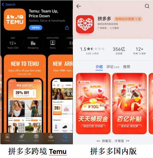 拼多多跨境电商平台Temu于9月1日正式在海外上线,9月1日到9月15号为测试期,APP Store应用详情页显示"Team Up,Price Down",与国内拼多多意思相近,即买的人越多,价格越低。但目前APP中并没有出现"砍一刀"和拼单的营销方式。