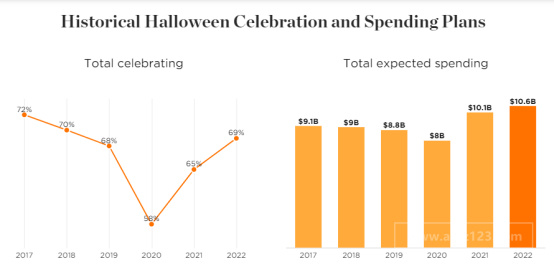 根据美国全国零售联合会由Prosper Insights & Analytics进行的年度调查,参与万圣节相关活动的人数将恢复到大流行前的水平,69%的消费者计划今年将庆祝这个节日,高于2021年的65%,与2019年的68%相当。随着参与人数的飙升,万圣节的总支出预计将创造记录达到106亿美元,超过去年的101亿美元的纪录。无论是当地的零售商,还是跨境卖家,这庞大的支出数据都他们都是一种极大的诱惑。