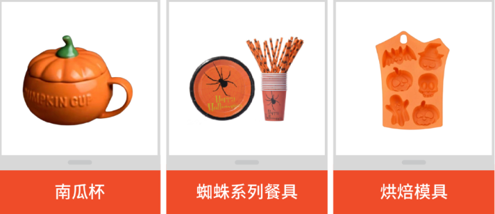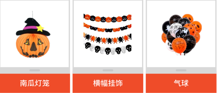 营造万圣节气氛少不了带有经典元素的各类装饰,如南瓜造型的灯笼、带有蝙蝠、蜘蛛等节日元素的横幅挂饰、气球等都是常见的热销单品。