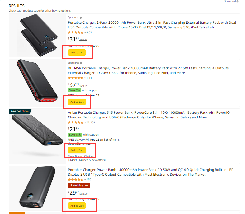 亚马逊最近更新了新的搜索结果页面展示方式,增加了"Add to Cart"的按钮,直接让卖家加入购物车,如下图: