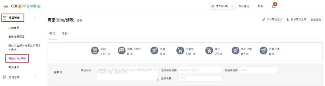 首先卖家现在可以在后台商品管理页面下的商品查询/修改页面中,选择所需要修改的商品,进入详情页修改并提交审核。可以修改的信息包括产品韩文标题,品牌信息,产品主图和详细信息等信息。