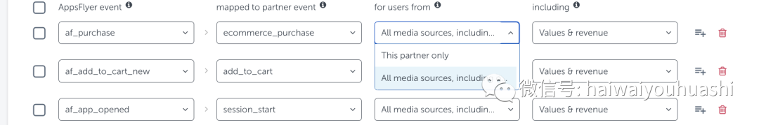 此处设置后的数据表现:如果这里设置了只回传本渠道数据,那么跑UAC2.5或者3.0的时候,AF只会把他认定为这个Google产生的event 才回传给到Google,AF的event转化数接近Google上的转化数,但是由于Google在安装的认领上属于自归因渠道先认领再给AF去按最后点击归因,所以实际上AF的安装数会小于Google的安装数。这里就存在一个GAP了,在AF上 归因给到Google的安装数是比Google自己的少,但是又在跑event的时候只给Google回传了AF归因的安装用户后续的event,这样Google自归因比AF多认领的安装所产生的event 就不会被AF回传给Google,这样从Google看转化率其实要比AF看起来差点。 但是FB的默认回传设置是全部都回传,所以FB的账面数据会比Google的好看一些。