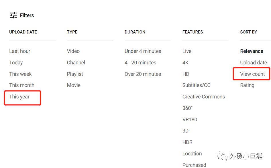 2. 点击Upload date中的This year或者This month → 点击View count。