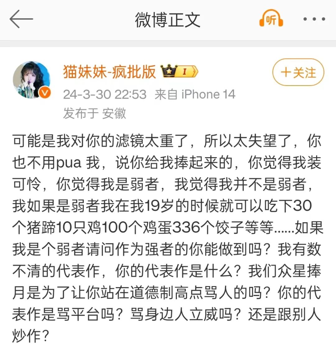 3月30日晚,快手粉丝量一度超过5000万的头部主播“猫妹妹”,在微博发文疑似炮轰自己的“师傅”辛巴:“可能是我对你的滤镜太重了,所以太失望了”“我们众星捧月是为了让你站在道德制高点骂人的吗?”“你的代表作是骂平台吗?骂身边人立威吗?还是跟别人炒作?”