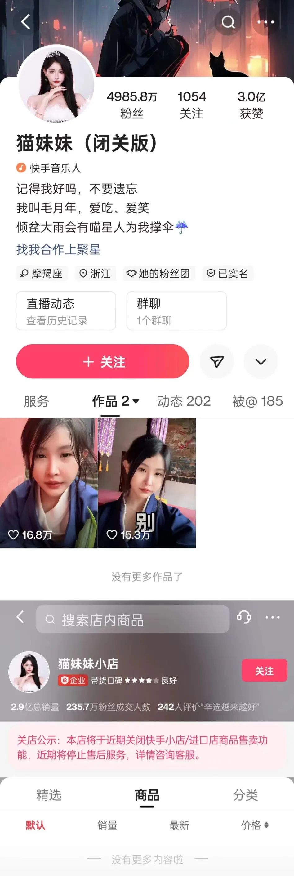 事情闹到这个份上,眼看是无法和平收场了。据悉,猫妹妹的快手账号已清除此前所有内容,个人小店也无商品在售,仅显示一条“关店公示”,她本人似乎也已经彻底离开了辛选。